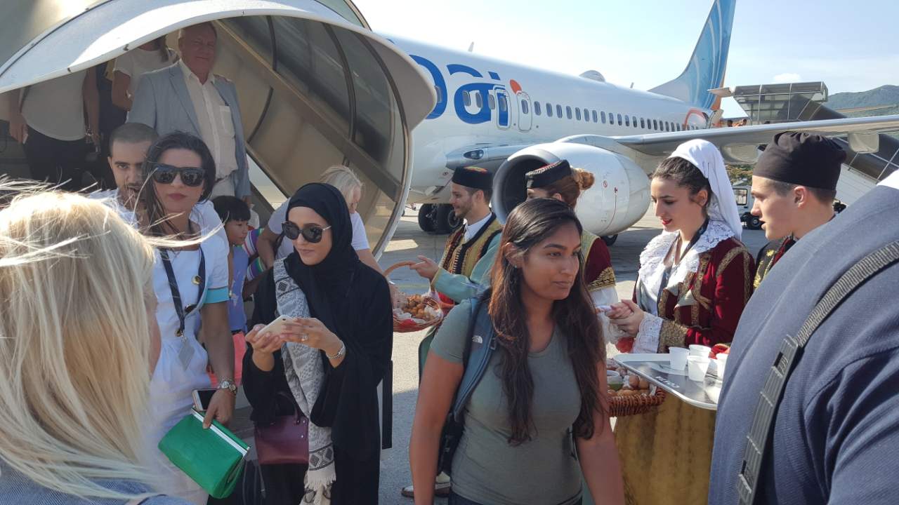 Ovom prilikom Folklorni ansambl KUD “Boka” je u Crnogorskoj i Bokeljskoj nošnji dočekao putnike “Fly Dubai” i počastio ih priganicama i domaćom rakijom. Sa prvim avionom kompanije Fly Dubai na aerodromu Tivat je sletjelo 170 putnika, Boingom 737-800.